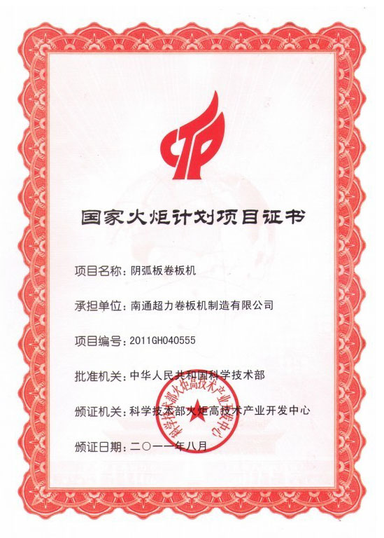 今年2月,南通超力卷板機制造有限公司正式接受到國家科技部頒發(fā)的“陰弧板卷板機”火炬計劃項目證書(shū)。至此,該火炬計劃項目正式立項。